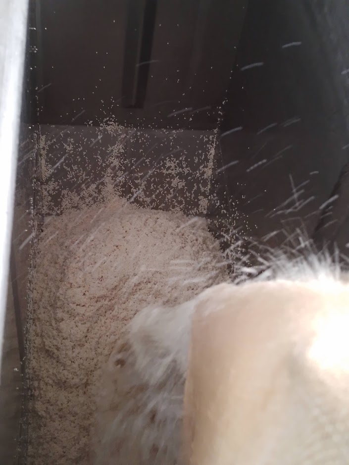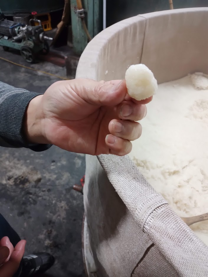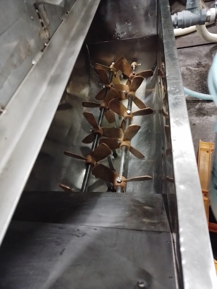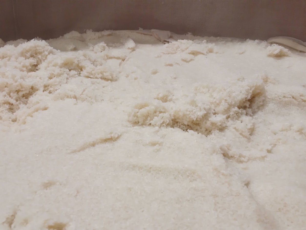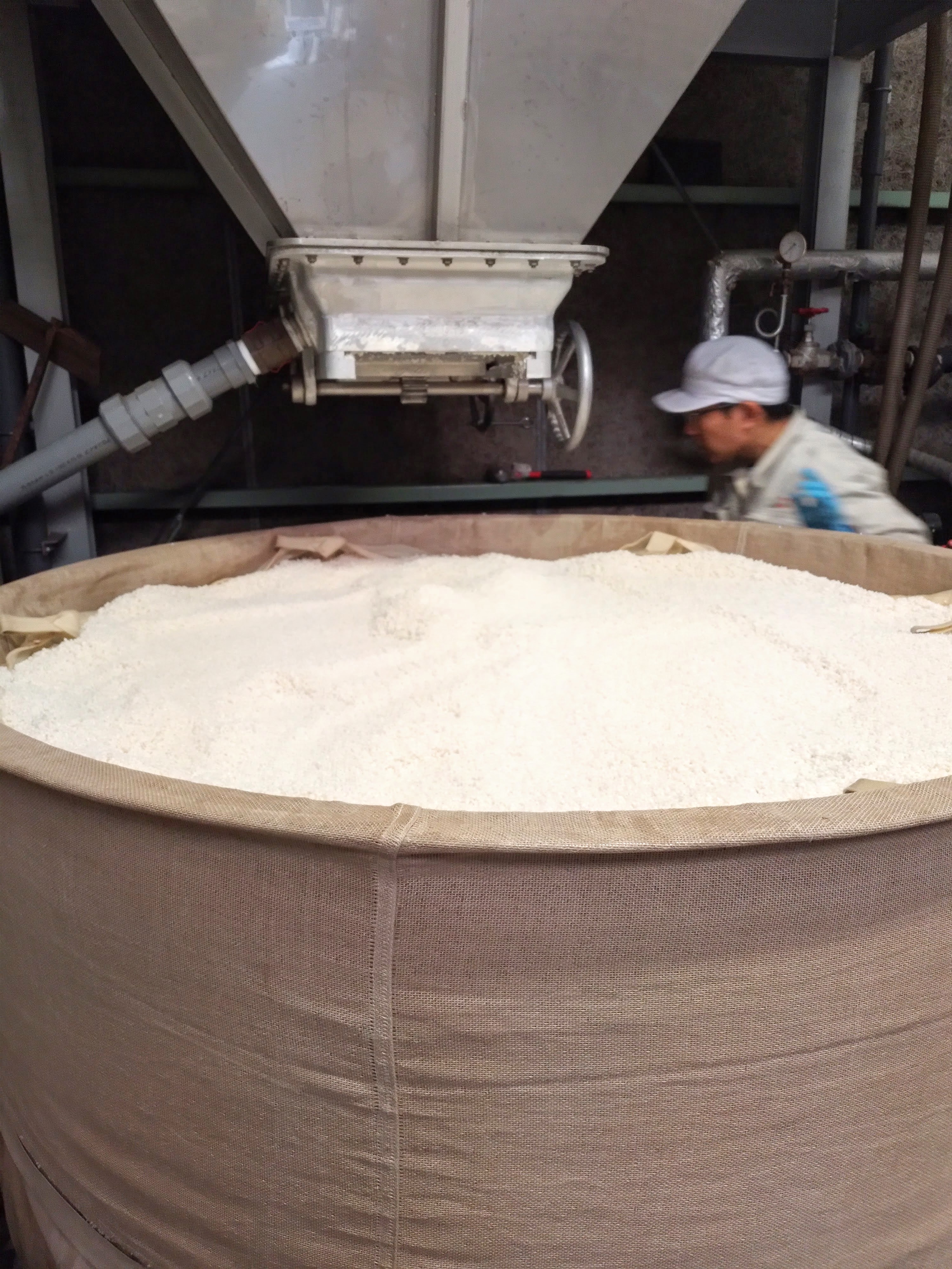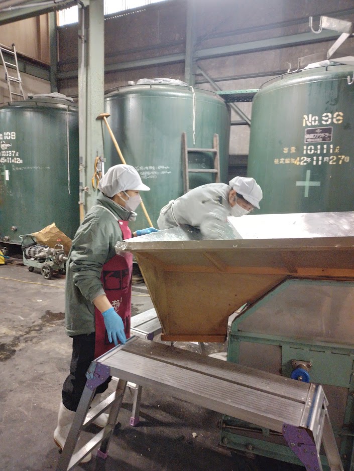 もち米を洗い、ポンプで吸い上げて上階の浸漬タンクに投入します。明日の朝、いつもの大蒸篭に入れて蒸しあげていきます。